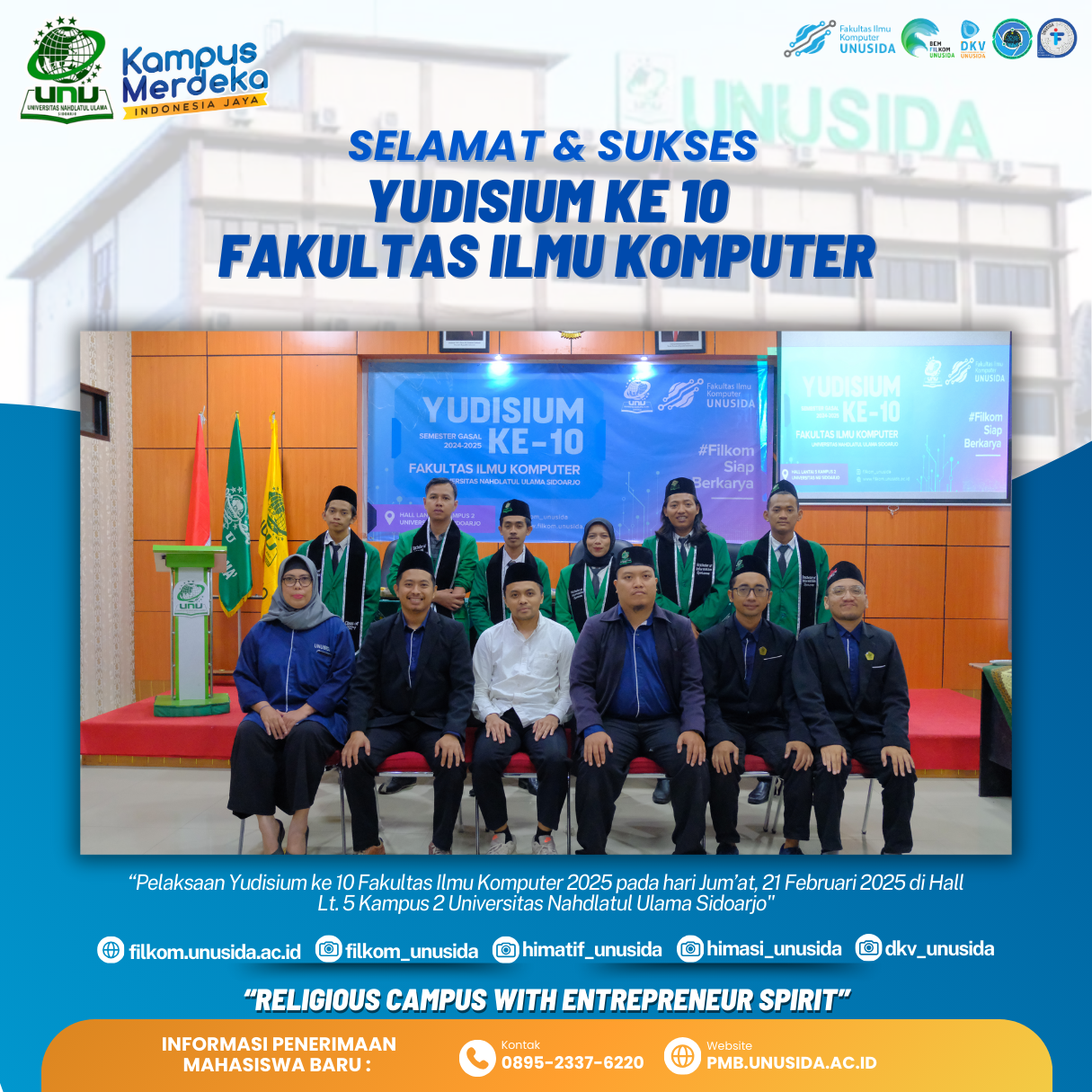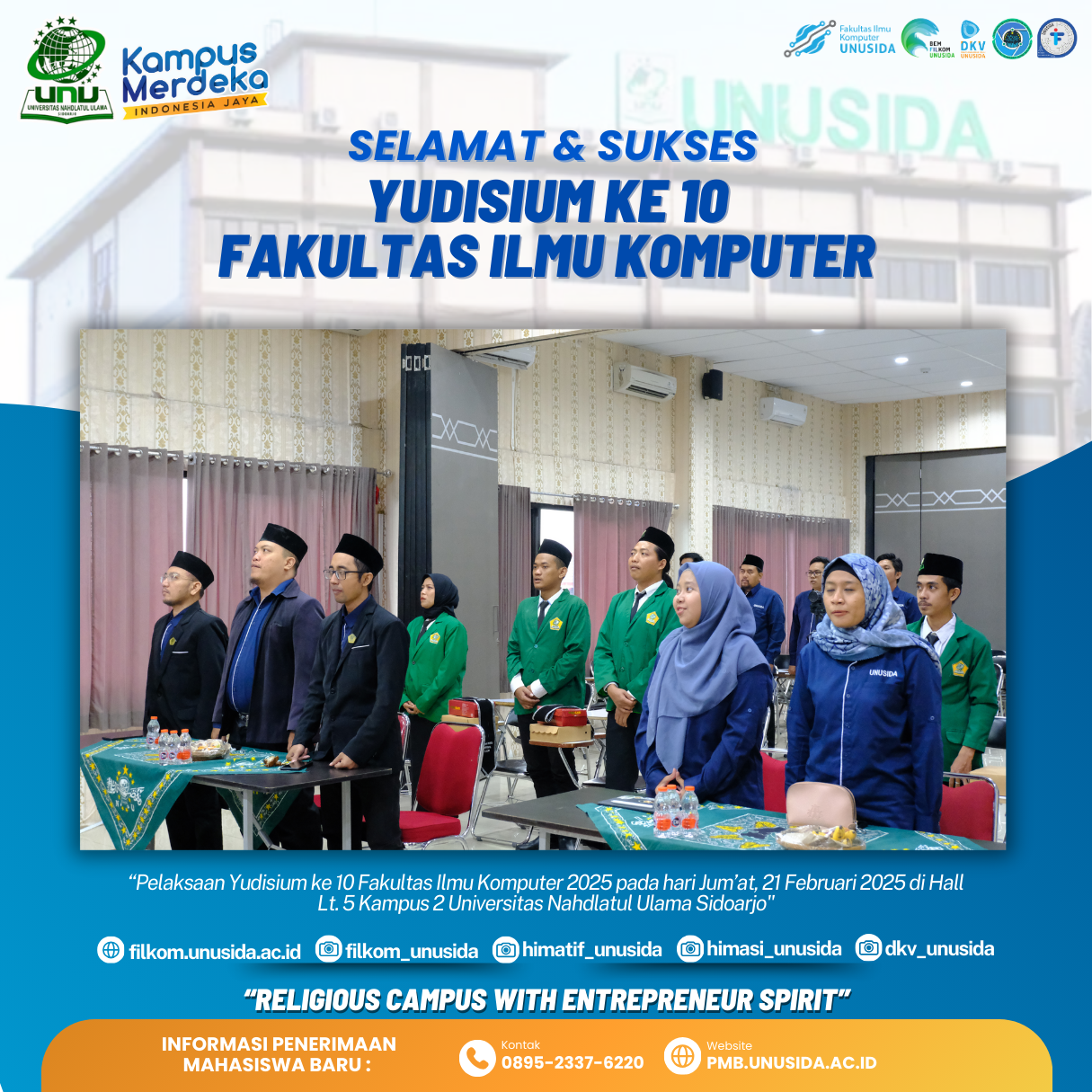 Fakultas Ilmu Komputer Universitas Nahdlatul Ulama Sidoarjo pada hari jum’at, 21 februari 2025 melakukan Yudisium ke 10. Acara yang dihadiri seluruh civitas akademika dilingkungan fakultas ilmu komputer ini dimulai pukul 16.00 WIB s/d selesai. Dekan fakultas ilmu komputer menyampaikan, semoga alumni ataupun mahasiswa yang telah di yudisium memiliki masa depan yang lebih baik khususnya di dunia kerja dan dapat mengharumkan nama kampus.